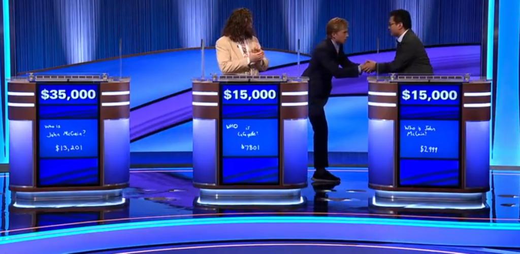 I don’t remember much of the details about the two-game finals, save for the broad strokes of how it went. I achieved a quite comfortable victory in the first round of the finals, thanks to the rather serendipitous fact that the animal in the correct answer, a rhesus monkey, was, as I’d written, also a “rhesus macaque”. What happened in the second game was, to be honest, a generational fumble on my end. I can blame a lot of things for my disappointing performance in the second game, from my fatigue (it was by then around 3-3:30 PM and it was my third game in a day) to a very unfavorable set of categories, but doubts still linger in my mind. It was true that if I’d won the SCC, I’d have had to film the following week for the Champions Wildcard and miss one of my seven weeks of classes, something which I wasn’t sure I could afford to do. But when I look back, I sometimes feel like I let my family and friends down by not doing better. Still, given Drew’s amazing performance in the Champions Wildcard, and later, the Tournament of Champions, as well as his rapid rise to Internet fame, I’ve never felt anything but positivity towards his ultimate victory in the SCC.