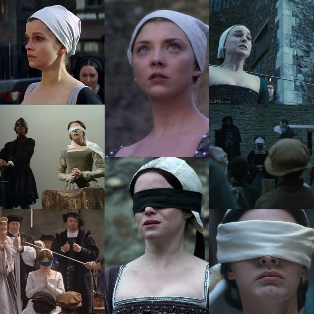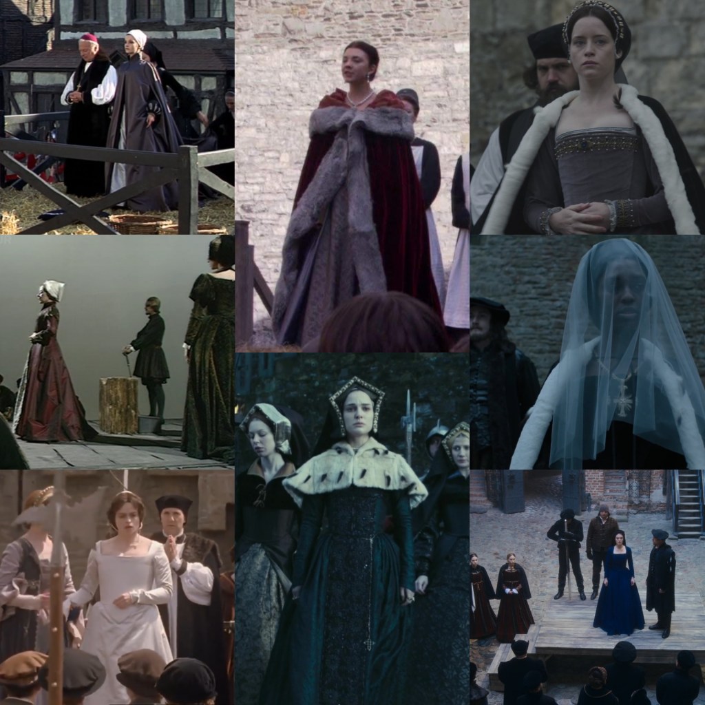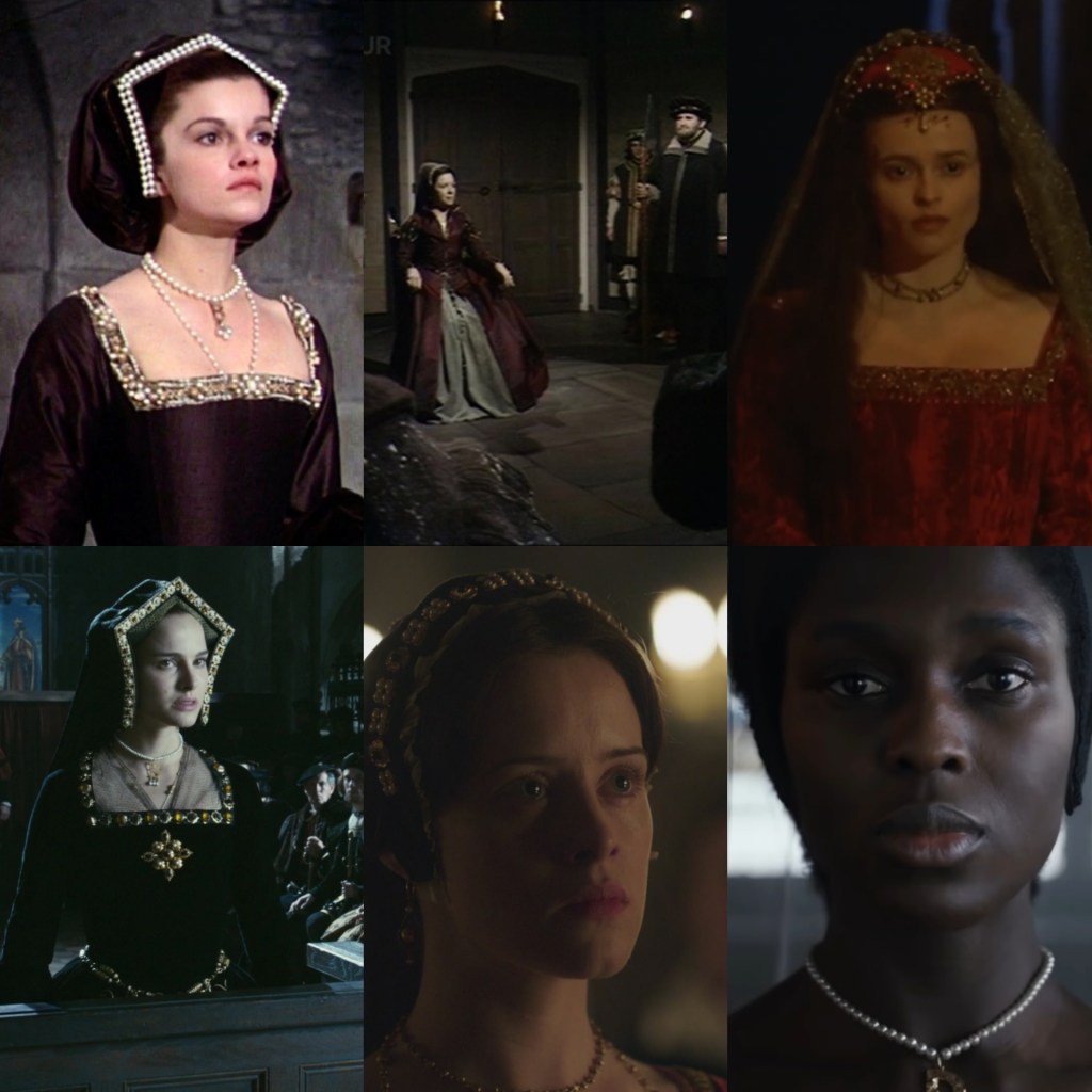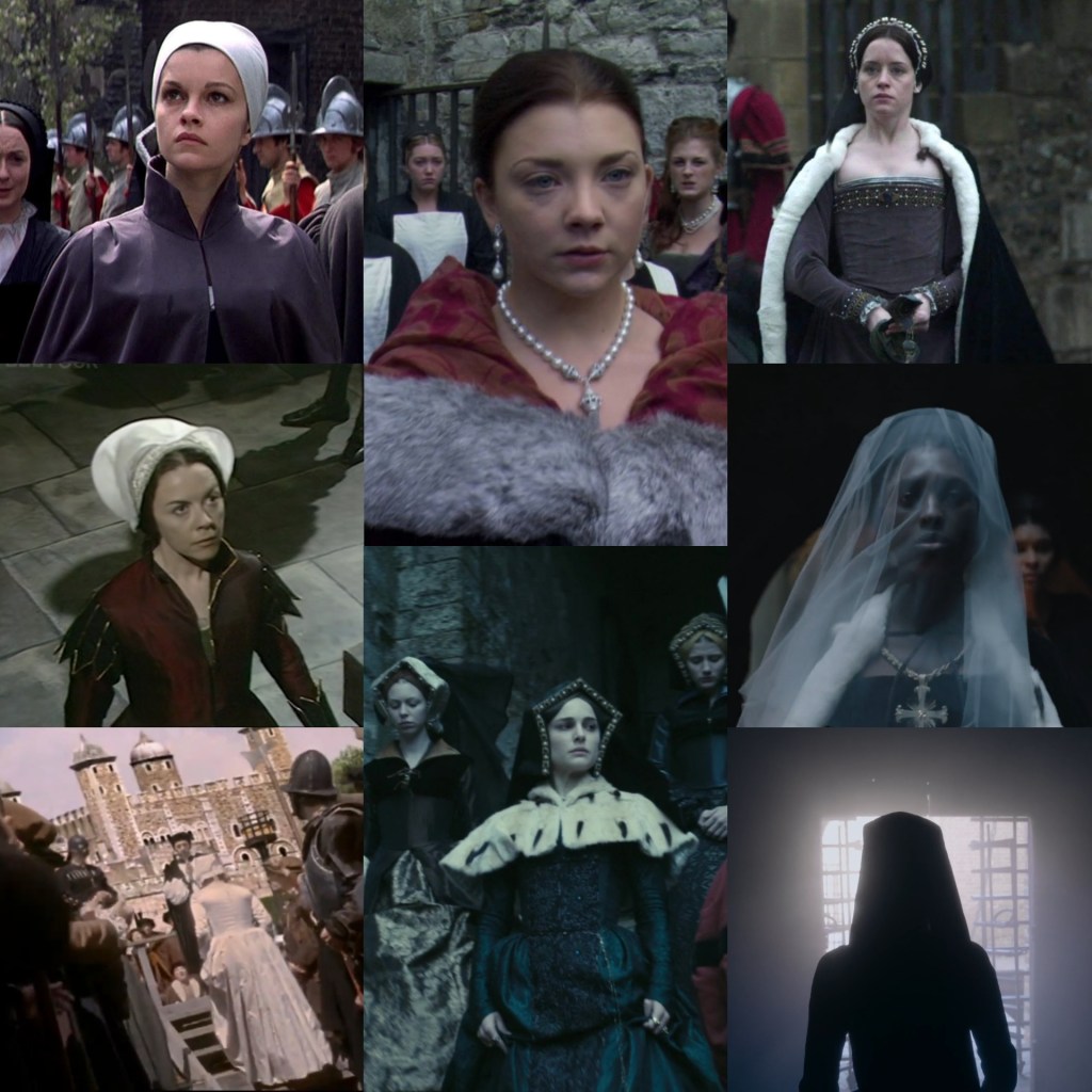 Anne’s trial on-screen, featuring, from left to right, top to bottom, Genevieve Bujold, Dorothy Tutin, Helena Bonham Carter in Henry VIII (2003), Natalie Portman in The Other Boleyn Girl (2008), Claire Foy in Wolf Hall (2015), and Jodie Turner-Smith in Anne Boleyn (2021). I am not apologizing for featuring Jodie; racists, leave now.