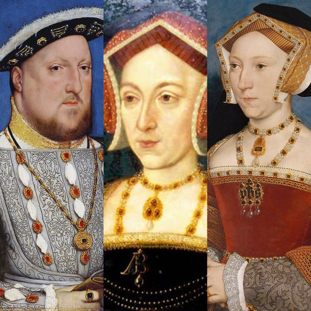Portraits of Henry VIII, Anne Boleyn, and Jane Seymour as they would have appeared in 1536; these works are respectively in the Thyssen-Bornemisza Museum in Madrid, Nidd Hall in North Yorkshire, and the Kunsthistorisches Museum in Vienna.