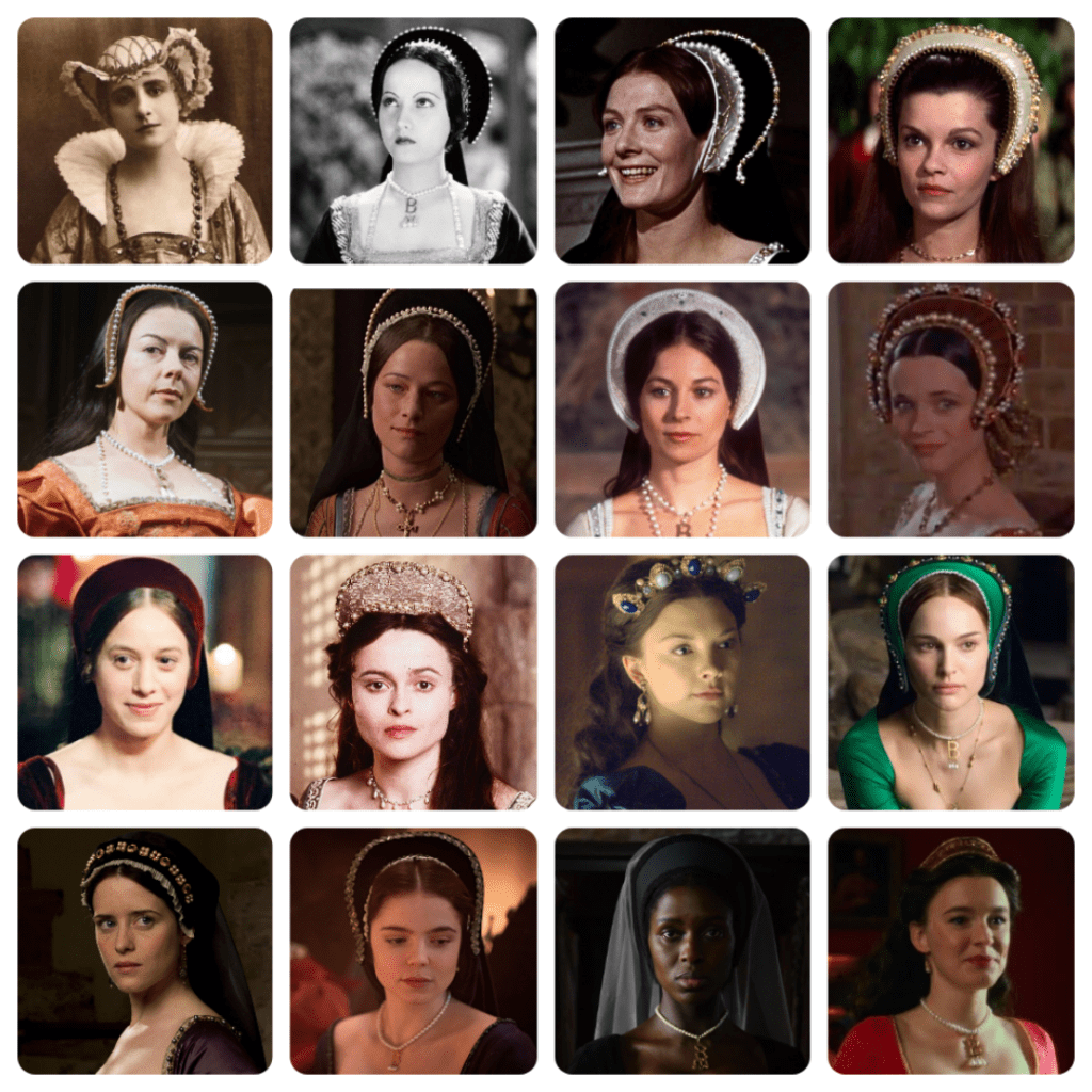 Sixteen on-screen depictions of Anne. From left to right, top to bottom, they are Henny Porten in Anna Boleyn (1920), Merle Oberon in The Private Life of Henry VIII (1933), Vanessa Redgrave in A Man for All Seasons (1966), Genevieve Bujold, Dorothy Tutin, Charlotte Rampling in Henry VIII and His Six Wives (1972), Barbara Kellerman in Henry VIII (1979), Oona Kirsch in God’s Outlaw (1986), Jodhi May in The Other Boleyn Girl (2003), Helena Bonham-Carter, Natalie Dormer, Natalie Portman, Claire Foy, Alice Nokes in The Spanish Princess (2019-2020), Jodie Turner-Smith, and Amy James-Kelly.