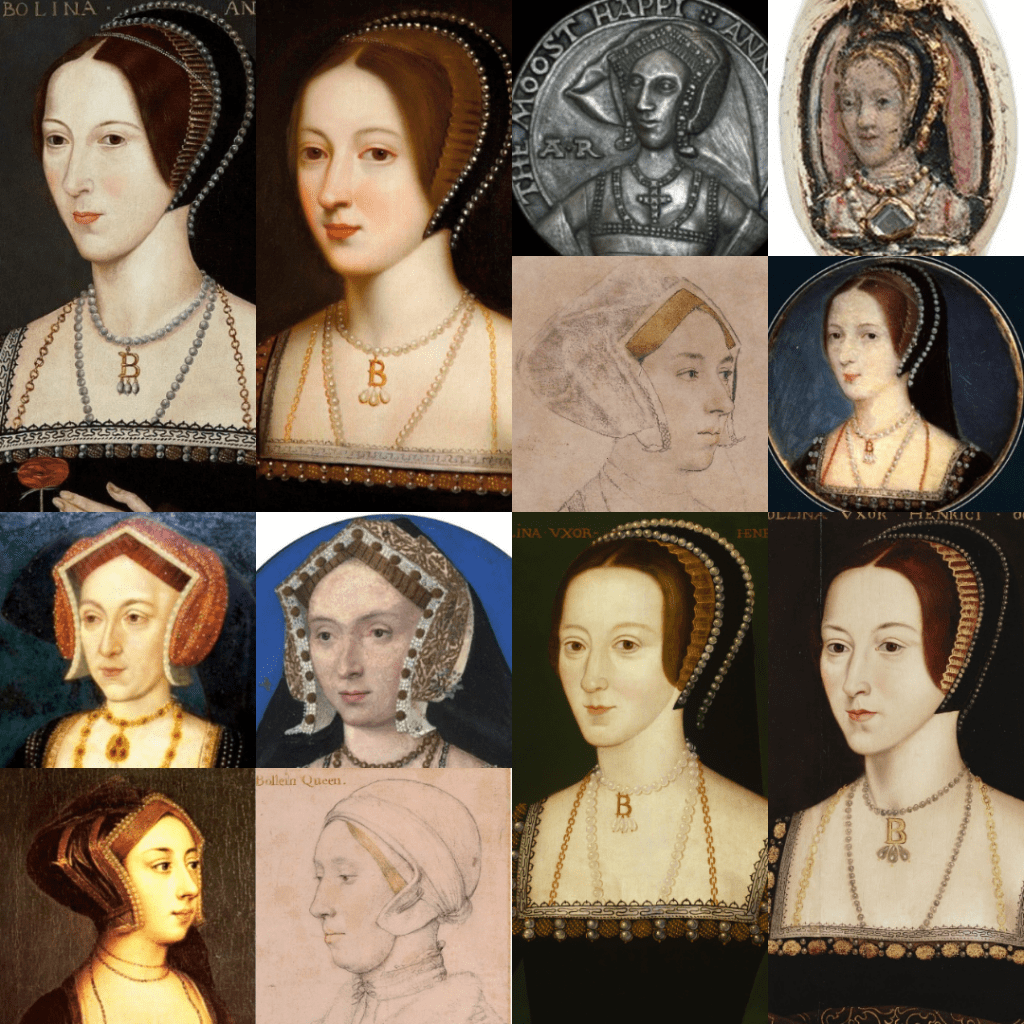 Various sixteenth- and seventeenth-century artworks depicting Queen Anne Boleyn. Only the grey portrait medal in the top-right corner is a contemporary likeness, and even this image is a reconstruction by artist Lucy Churchill. The sepia sketches by Holbein are possibly of her, as is the circular miniature of her in the center of the image, but these attributions are not for certain.