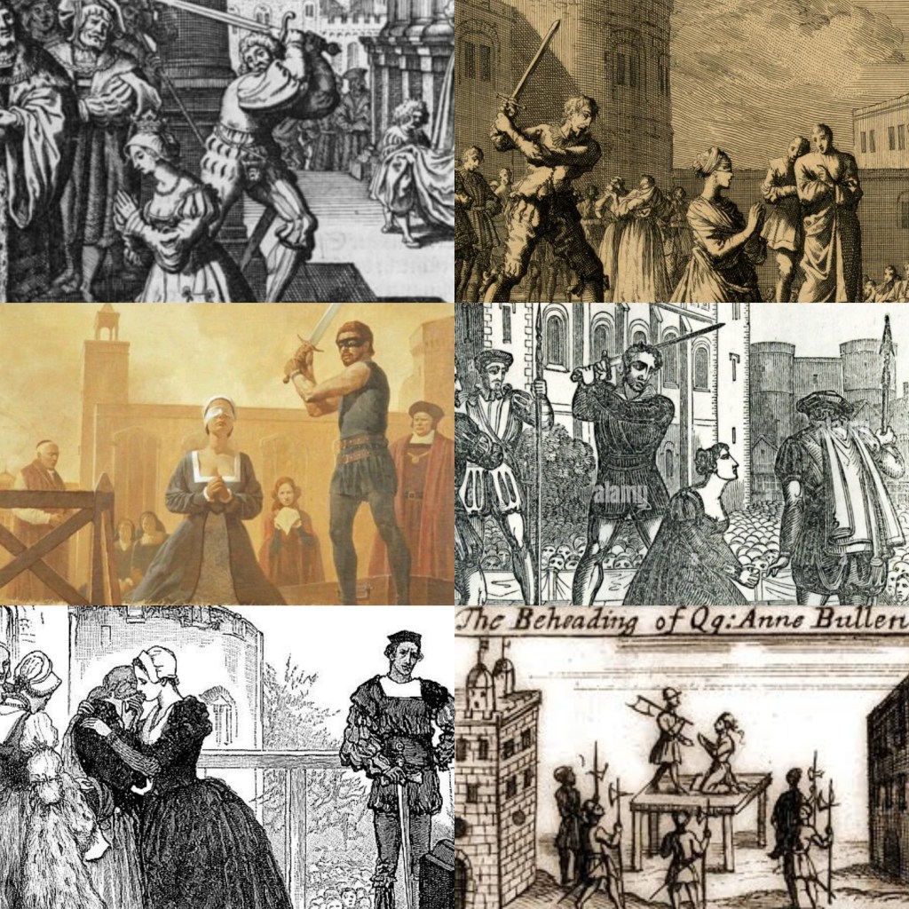 Her speech done, Anne turned to her ladies, who carefully removed her ermine mantle. They were now in tears, a far cry from how they had taunted and spied on her initially. She took off her gable hood herself, making sure her hair had not slipped out from its coif. Then, she said farewell to her ladies, comforting them and asking for their prayers. The executioner, who de Carle describes as “distraught / And troubled by the execution”, begged her forgiveness, which she granted. Then, Anne paid him and knelt, taking care to fasten her gown about her feet, ensuring that her legs would not be visible if her skirts moved at her death. One of her ladies blindfolded her, as she prayed over and over, “To Christ I commend my soul! Jesu, receive my soul!”