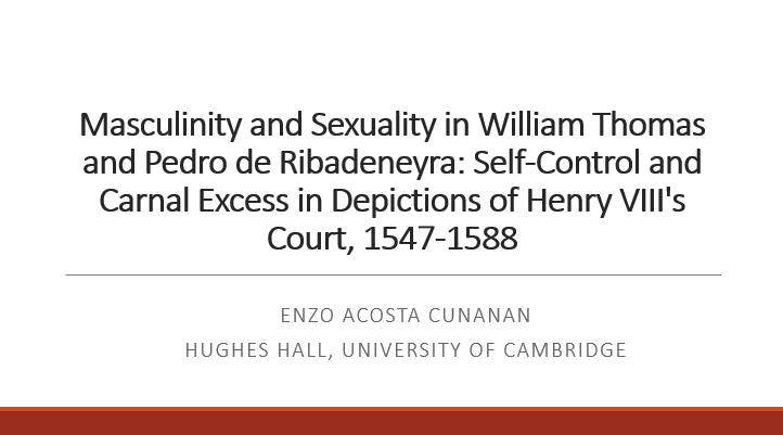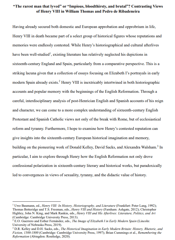 In my dissertation, I argued that both Thomas and Ribadeneyra, shaped by a tense atmosphere where both they and their kings sought to respond to the English Reformation, portrayed Henry VIII’s life in an exemplary, didactic fashion. Whether seeking to encourage the Tudor state’s fervent implementation of Protestant reform or Spaniards’ material and spiritual support for the Armada, Henry’s life and reign became a collection of either positive or negative moral exempla, designed to instruct their audiences in virtue. While Thomas presented Henry as an exemplary monarch, man, and believer, marked by good governance, masculine self-control, and enthusiasm for Protestant reform, Ribadeneyra excoriated him as an impious heretic, bloodthirsty tyrant, and an ‘effeminate’ captive to his carnal urges. To accomplish this, both used additional exempla from English history, appeals to primary sources, and elision of the facts of his reign that complicated their argument. Their works were not just serious depictions of Henry VIII but notable additions to sixteenth-century political, social, and religious discourses.